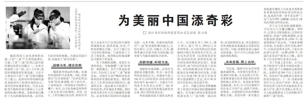可以說,隨著全社會對環保越來越重視,為環保行業帶來了發展的大機遇。在過去的幾年里,奇彩依靠強大技術團隊和研發體系的核心競爭力,各項業務得到迅速拓展。如今,公司可以根據不同企業之不同產品,提供個性化、系統化、全流程的污水治理整體解決方案,是國內第一家有能力系統地實施化工行業廢水零排放及資源化的環保治理高科技企業,也是國內第一家專業從事“三高”(高COD、高酸堿、高鹽分)廢水治理的高科技企業。